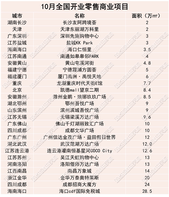 據(jù)觀點指數(shù)統(tǒng)計,期內(nèi)全國范圍內(nèi)共開業(yè)26個零售商業(yè)項目(含購物中心、社區(qū)商業(yè)、街區(qū)商業(yè)及奧特萊斯,面積≥2萬平方米),新入市總體量為92.7萬平方米。項目數(shù)量、體量不及上月,經(jīng)歷集中開業(yè)潮后市場熱度有所下降。