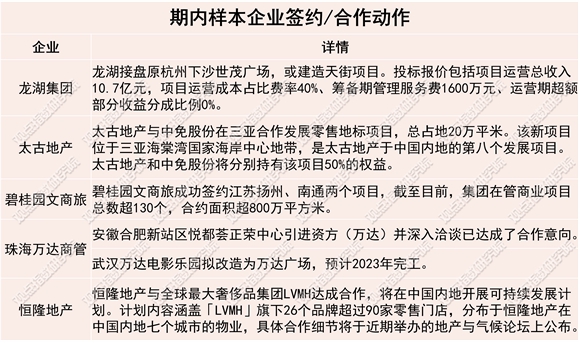 期內(nèi),樣本企業(yè)的簽約動作并不多,主要由頭部企業(yè)貢獻(xiàn),如龍湖集團、太古地產(chǎn)及珠海萬達(dá)商管等。