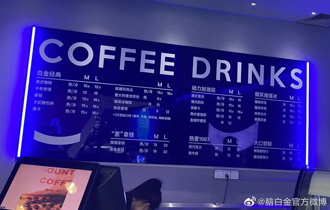 從價(jià)格看,除了咖啡,門店售賣的茶飲、沙冰、水果榨汁等飲品,絕大部分價(jià)格都在20元以下。對(duì)于聚焦這一價(jià)格帶,腦白金官方稱“在魔都算是相當(dāng)友好了”。