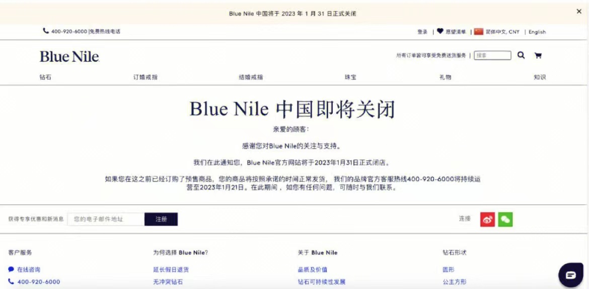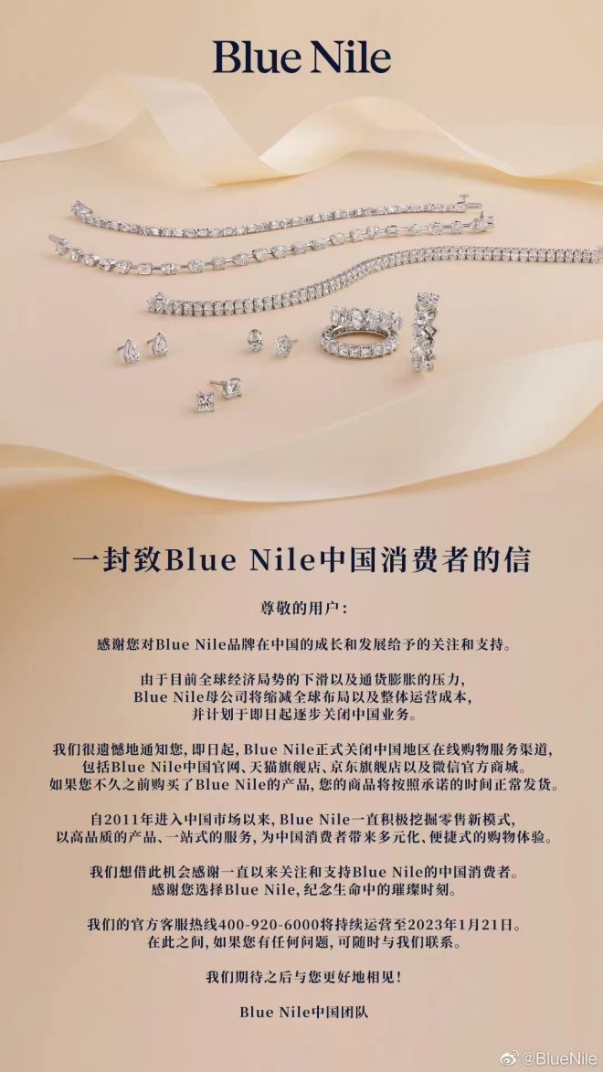 日前,Blue Nile發(fā)布了《一封致Blue Nile中國消費(fèi)者的信》。在公開信中,Blue Nile表示由于目前全球經(jīng)濟(jì)局勢的下滑以及通貨膨脹等壓力,Blue Nile母公司將縮減全球布局以及整體運(yùn)營成本,并計(jì)劃于即日起逐步關(guān)閉中國業(yè)務(wù)。