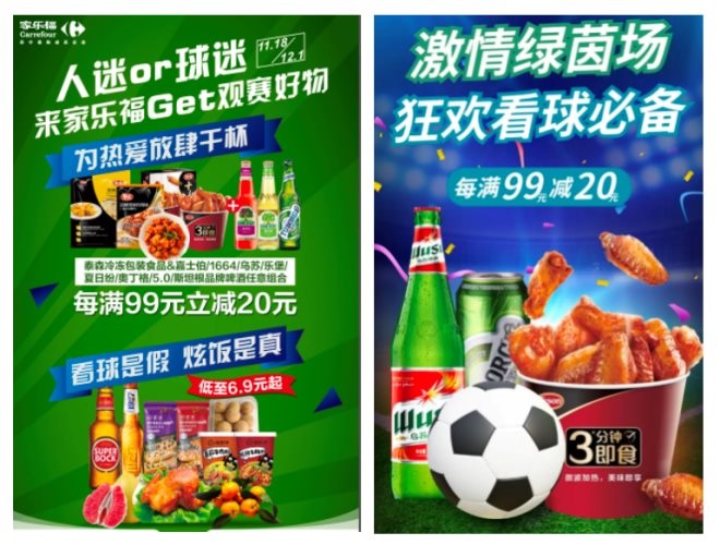 人們對(duì)于足球的熱情也折射到足球相關(guān)產(chǎn)品上,家樂(lè)福中臺(tái)數(shù)據(jù)顯示,11月份以來(lái)圍繞賽事相關(guān)消費(fèi)類商品銷量出現(xiàn)上漲趨勢(shì),比如家樂(lè)福熱銷啤酒、小龍蝦、薯片、鹵味等商品銷量與去年同期相比,均出現(xiàn)65%~112%以上增長(zhǎng)。