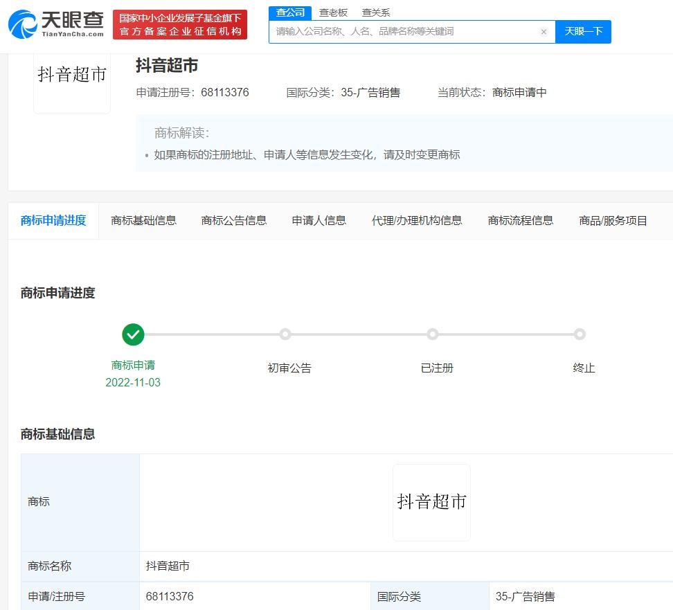 近日,據(jù)天眼查信息顯示,北京字跳網(wǎng)絡(luò)技術(shù)有限公司申請(qǐng)注冊(cè)“抖音超市”商標(biāo),國(guó)際分類涉及廣告銷售、教育娛樂(lè),當(dāng)前商標(biāo)進(jìn)度均為申請(qǐng)中。