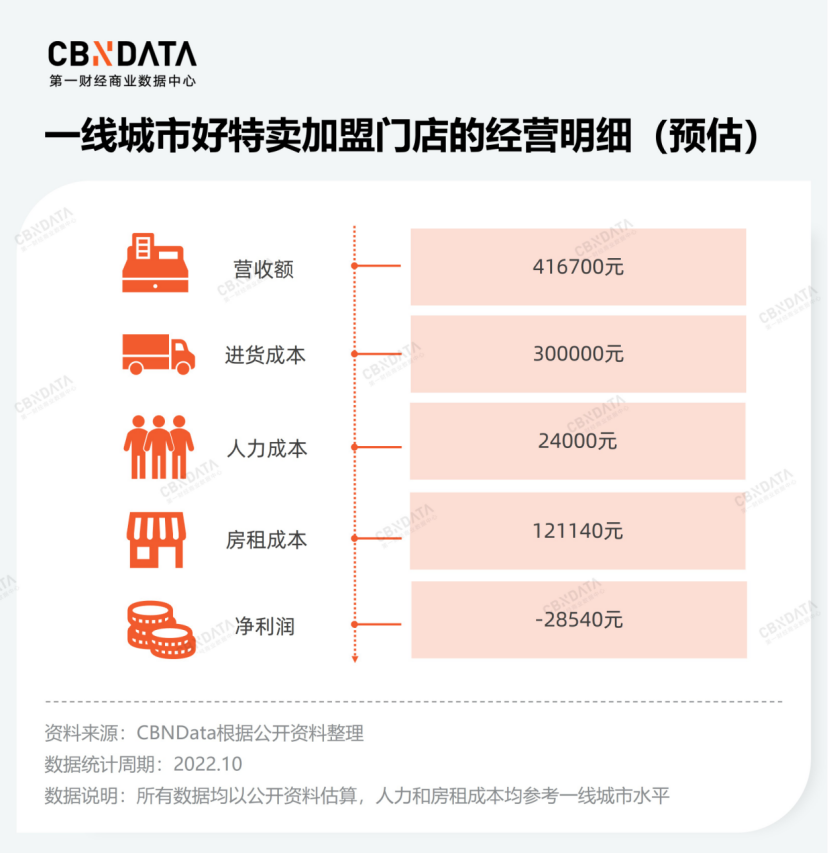據(jù)此推算,一間150㎡的好特賣加盟店月毛利潤(rùn)約11.66萬(wàn)元。再將店租、用人成本考慮進(jìn)來(lái),以好特賣最愛(ài)入駐的購(gòu)物中心為例,根據(jù)中指研究院,今年上半年全國(guó)重點(diǎn)城市100個(gè)典型購(gòu)物中心的平均租金為26.96元/㎡/天,以此估算,一間150㎡店鋪的月租金高達(dá)約12萬(wàn)元。參考Boss直聘上好特賣薪資范圍的中位數(shù)來(lái)看,招聘4名店員的人力成本約2.4萬(wàn)元。扣除這些,每月要虧損近3萬(wàn)元。這還不包括咨詢服務(wù)費(fèi)、資料使用費(fèi)等加盟費(fèi)用。