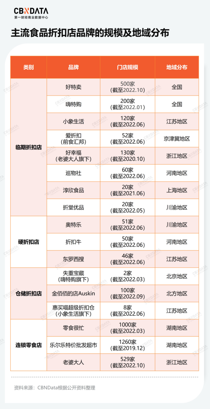 鄧大勇告訴CBNData,大多數(shù)臨期食品店里有四種產(chǎn)品:保質(zhì)期還剩2-3個(gè)月的純臨期,保質(zhì)期3-6個(gè)月的大日期貨,6-10個(gè)月的尾貨以及正期貨。換言之,臨期折扣店不止賣臨期。根據(jù)公開資料,好特賣和嗨特購(gòu)的臨期商品占比已從疫情初期的50%,降至當(dāng)前的20-30%。