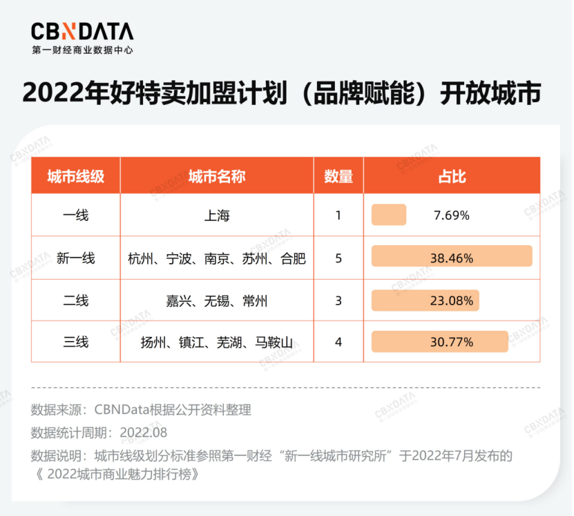 一線城市的激烈競(jìng)爭(zhēng)之下,不少玩家已經(jīng)在往下沉市場(chǎng)滲透。根據(jù)好特賣的加盟計(jì)劃,沿用“好特賣”品牌的加盟模式所開放的城市中,二線、三線城市占比超一半,還包括鎮(zhèn)江、蕪湖、馬鞍山等三線城市。疊加其“未來(lái)三年開出5000家店”的計(jì)劃來(lái)看,下沉市場(chǎng)顯然是其未來(lái)布局的重要一環(huán)。