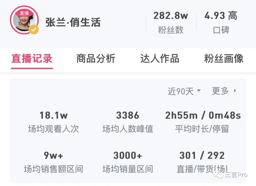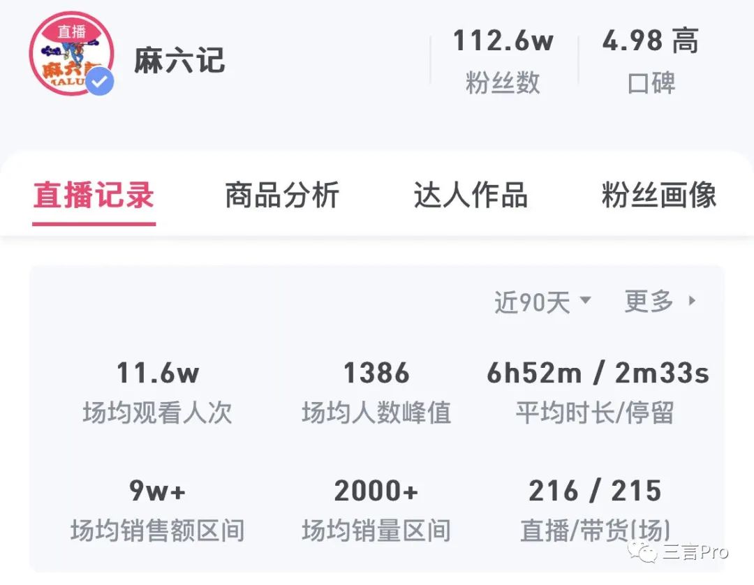 數據顯示,近3個月張?zhí)m直播場均銷售額在9萬左右,麻六記也是9萬這個區(qū)間。當然這還是算上了最近3天后的平均值,如果忽略這三天,那么銷售額會更低。