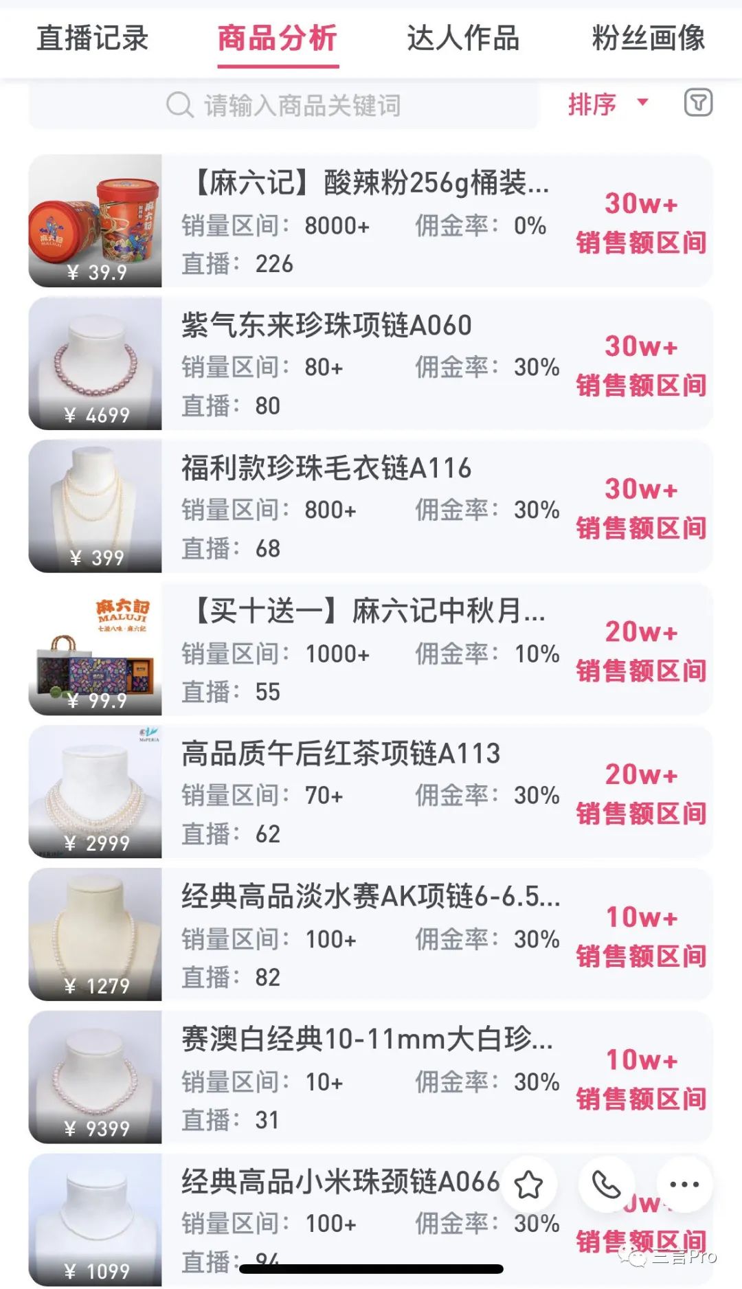 但是以往張?zhí)m直播帶貨雖然也有麻六記,但比例相比這幾天要低得多。數據顯示,從9月1日至11月20日這近3個月的時間里,張?zhí)m直播間銷售額前十名只有3個是麻六記的產品,其余都是珠寶類的產品。