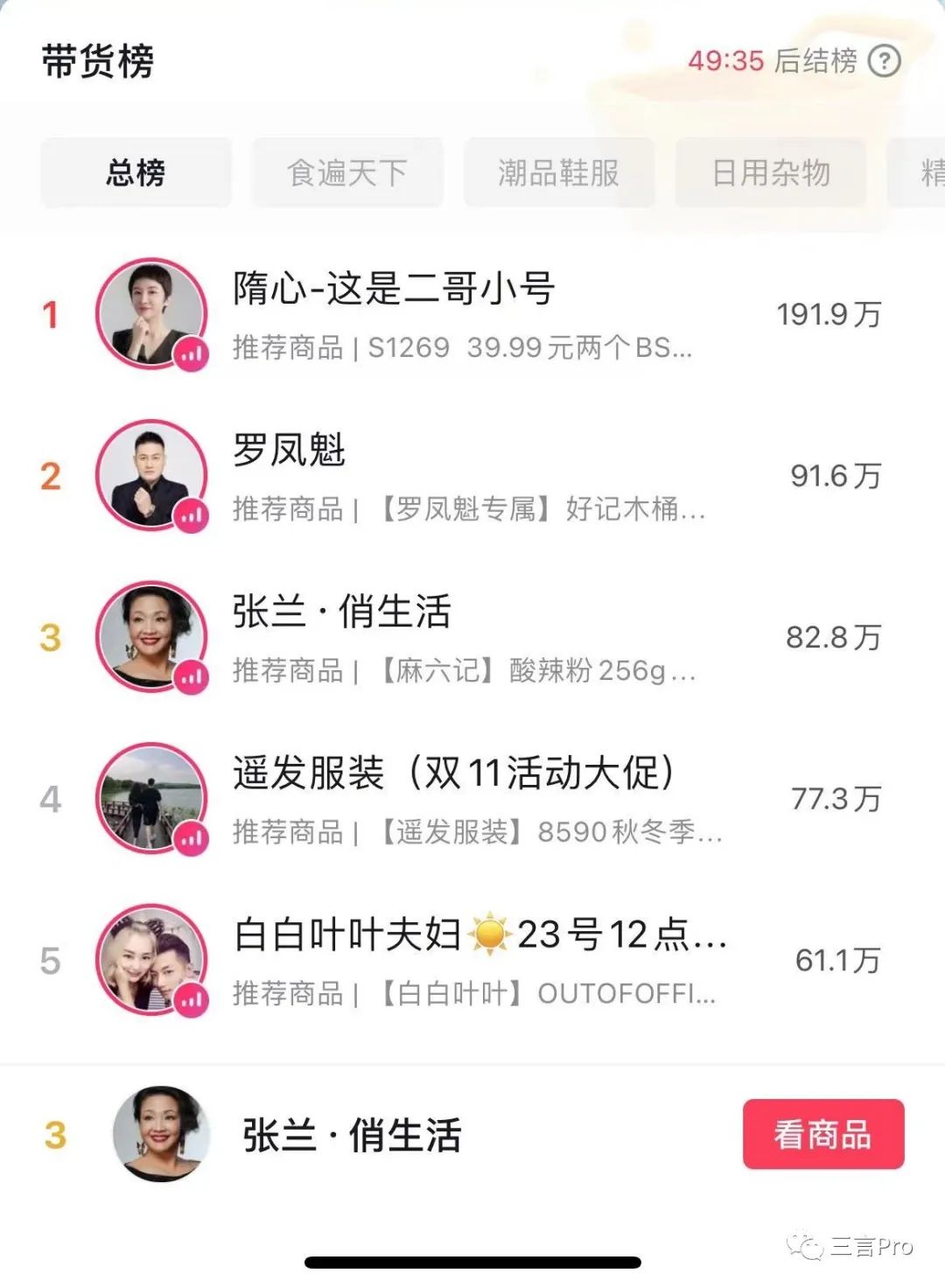 今日,張?zhí)m在中午12點半開播,14點左右張?zhí)m直播間一度登上抖音帶貨總榜的第三名,“食遍天下”細分榜單的第一名。