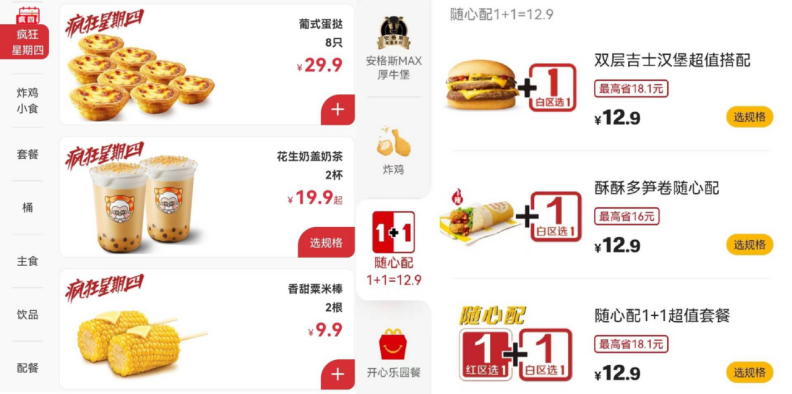 肯德基“瘋狂星期四” VS 麥當(dāng)勞“1+1隨心配”,圖源:肯德基、麥當(dāng)勞小程序