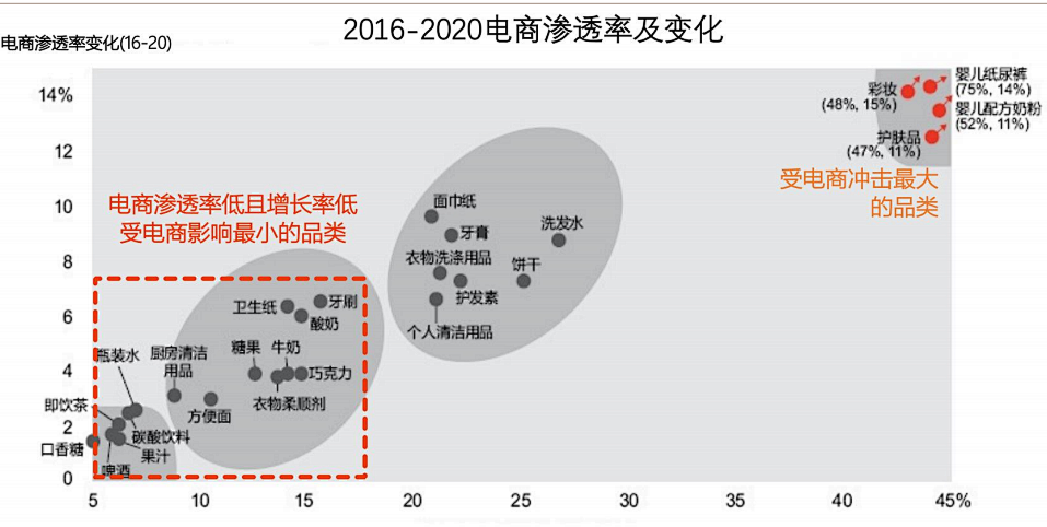 食品、生鮮具備即時消費屬性,線上滲透率有限,更適合線下場景。