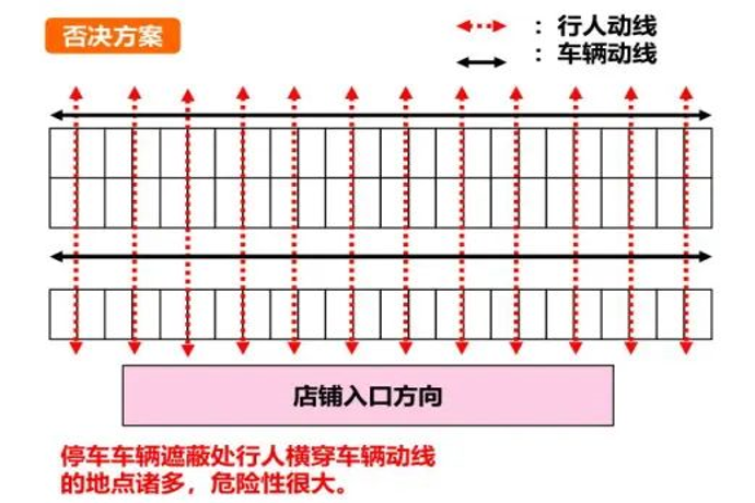 如下圖的一個停車場案例,傳統(tǒng)將車尾朝向店鋪入口方向的做法,容易造成停車動線和人出入動線的交叉,造成一定的安全隱患。