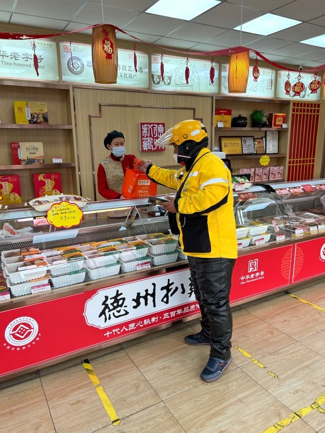▲美團騎手前往月盛齋門店取顧客訂單。受訪者供圖