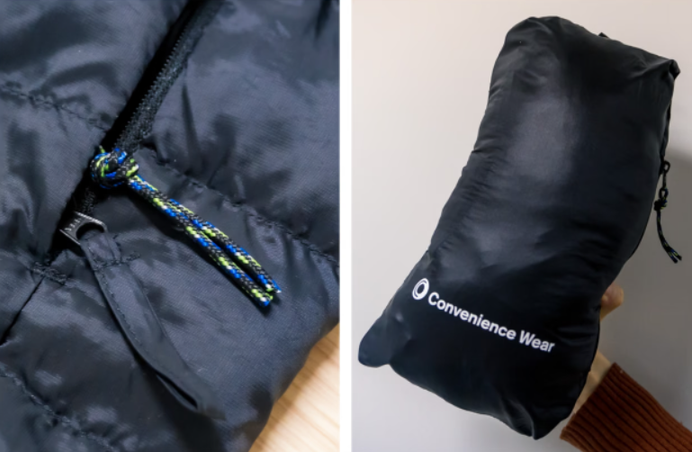 這 款黑色“無性別”羽絨服是全家旗下原創(chuàng)服裝系列Convenience Wear的新品,11月22日起,在東京約90家門店開售,有M和L兩種尺寸,沒有標簽,產(chǎn)品信息直接印于內襯。最凸顯其“便利”基因的是衣服的便攜性,它可以整體折疊進左邊的口袋里,方便收納和攜帶。