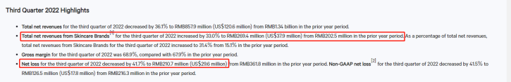 護膚業(yè)務在第三季度逆勢上揚,實現營收2.69億元,同比增長高達33%,占總營收比例上升至31.4%。