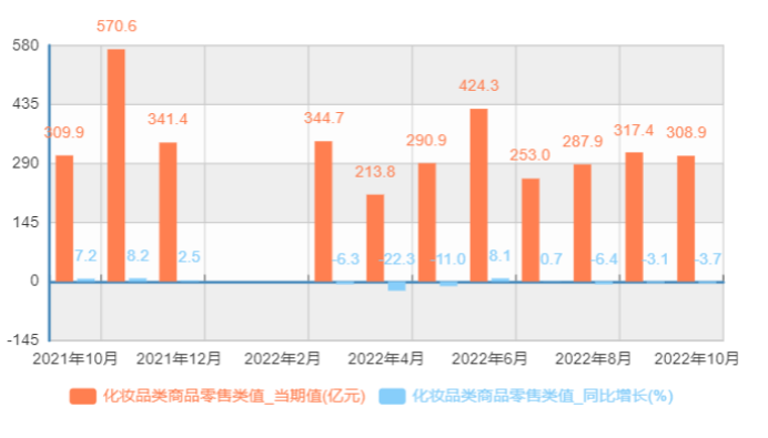 國家統計局最新數據顯示,2022年我國化妝品類商品零售額在6月、7月分別實現了最高8.1%和0.7%的正向增長,其余月份同比增長為負,4月甚至達到了-22.3%的比例。