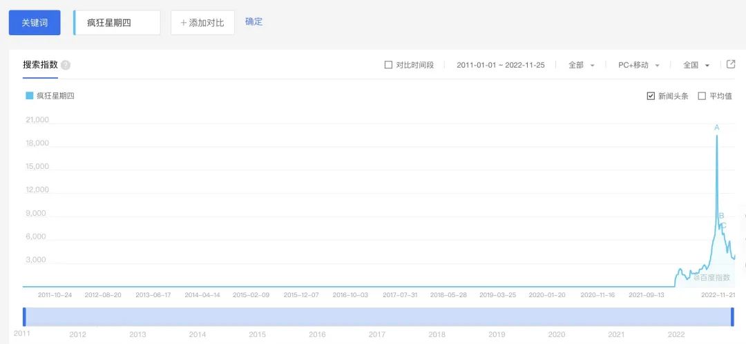 “瘋狂星期四”的效果立竿見(jiàn)影,百勝中國(guó)第三季度財(cái)報(bào)顯示,三季度肯德基營(yíng)收同比增長(zhǎng)12%,經(jīng)營(yíng)利潤(rùn)同比增長(zhǎng)67%。但是值得注意的是,根據(jù)百度指數(shù),“瘋狂星期四”的熱度已經(jīng)從十月份開(kāi)始逐漸冷卻。
