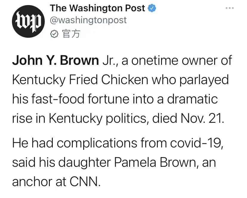據(jù)《華盛頓郵報(bào)》報(bào)道,約翰·布朗于11月21日去世,享年88歲。在肯德基七十年的發(fā)展歷程中,有兩位重要的領(lǐng)路人:一位是肯德基創(chuàng)始人哈蘭·桑德斯,也就是花白胡子的肯德基老爺爺,已經(jīng)于上世紀(jì)八十年代去世;另一位就是帶領(lǐng)肯德基成功上市的約翰·布朗。