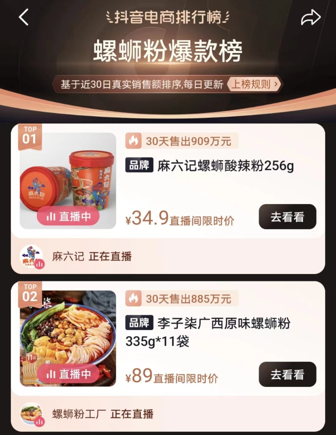 截止到目前,在張?zhí)m直播間,“麻六記”的預(yù)制菜不斷被賣爆,主打酸辣粉單價39.9元,已售177.3萬份。以價格銷量換算,累計賣出了7000多萬元。僅就11月21日到23日,張?zhí)m抖音賬號共完成9場直播,累計漲粉82萬,場均觀看人次高達530萬,累計直播銷售額在1000到2500萬元。與此同時,麻六記官方賬號也沒有閑著,同樣開播了7場,直播銷售額超1000萬元。由于售賣火爆,麻六記的桶裝酸辣粉處于預(yù)售階段,發(fā)貨時間延后至12月8日才能發(fā)出。