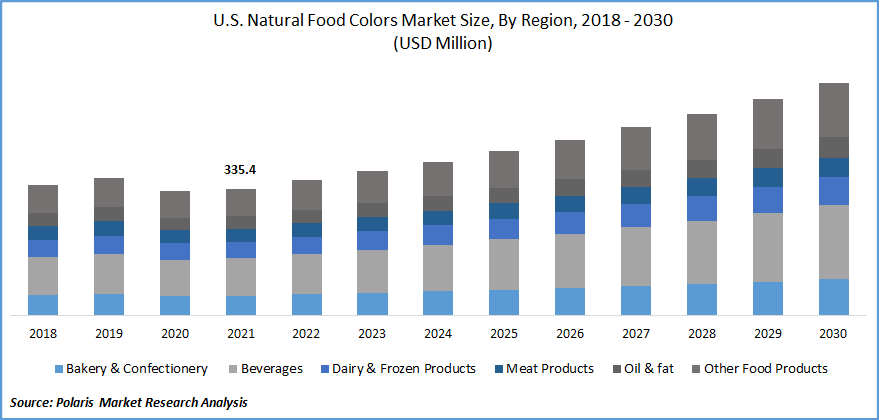 2018年~2030年 美國天然食用色素市場規(guī)模 數(shù)據(jù)來源:Polaris Market Research
