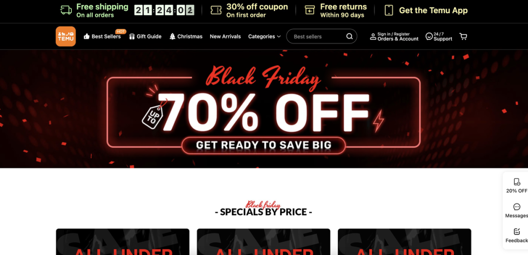 拼多多旗下跨境電商Temu今年9月正式進入美國,10月底Temu網(wǎng)站首頁就出現(xiàn)了Black Friday Early Access的字樣。在Temu黑五大促期間,“低價”貫穿始終:折扣最高達到70%,站內(nèi)還有10美元、20美元、30美元專場。在物流方面,Temu在大促期間還舉行滿99元免運費活動,并為消費者提供“7日內(nèi)送達”的物流選項,而一般來說,Temu上產(chǎn)品物流時間大約為7到15天。