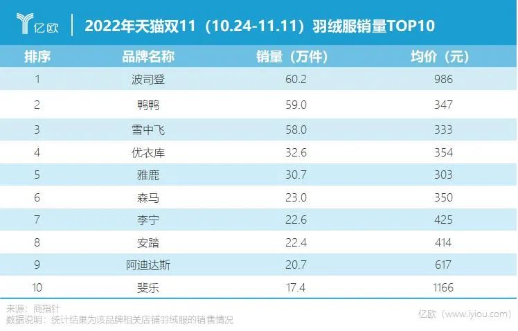 雖然波司登以60.2萬件銷量位于羽絨服品類第一,但定位性價比的老牌國貨品牌鴨鴨、波司登旗下中低端品牌雪中飛以及雅鹿也分別以59萬件、58萬件和30.7萬件的銷量緊隨其后。能看到的是,這些品牌的均價不足350元,只有波司登均價的1/3左右。