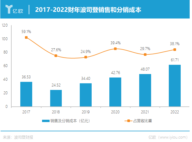 此前的2020財年和2021財年,波司登銷售分銷開支分別為42.76億元和48.07億元,占集團總營收分別為39.4%和29.7%。整體來看,波司登每年花在營銷上的費用要占總營收的近4成。