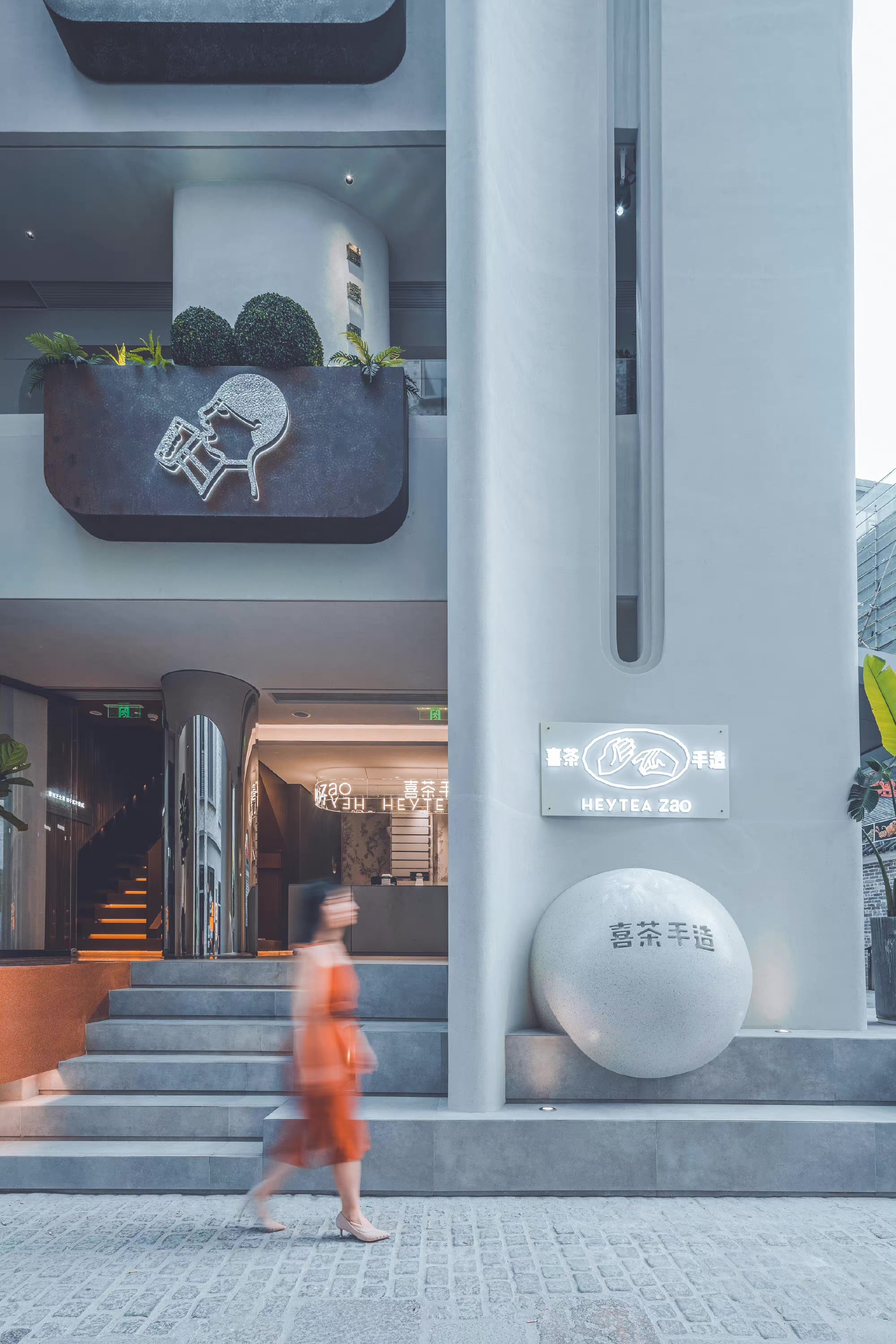 喜茶手造店開設(shè)在歷史濃厚的文化街區(qū),人流密集且以年輕群體為主。整間門店劃分出三層點單區(qū)域,一樓用于制作手造炒冰,二樓提供手搗果茶,三樓提供手作特調(diào)和純茶,頂樓花園留出一定社交空間,便于顧客打卡。