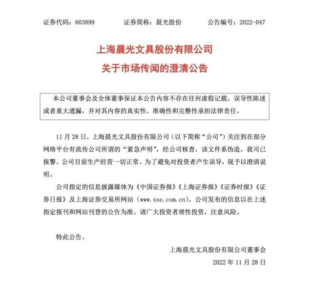 11月28日開盤前,晨光股份發(fā)布公告稱,經(jīng)公司核查,在部分網(wǎng)絡平臺有流傳公司所謂的“緊急聲明”系偽造。該公司已報警,目前生產(chǎn)經(jīng)營活動一切正常。