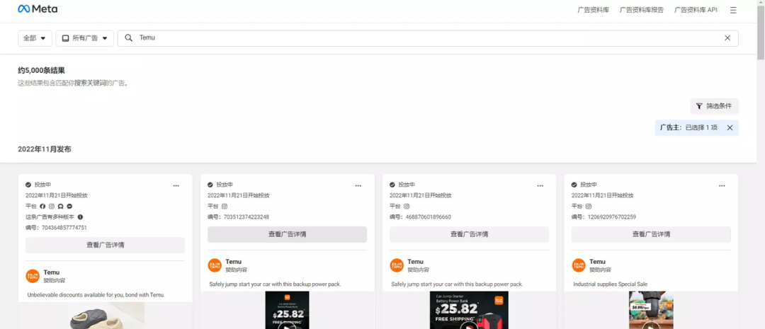 根據(jù)億邦動(dòng)力在Meta后臺(tái)觀察到的數(shù)據(jù),僅僅10月份,Temu就在Facebook發(fā)布了1600+條廣告,在截至目前的兩個(gè)多月時(shí)間里,則累計(jì)投放了5000條左右。