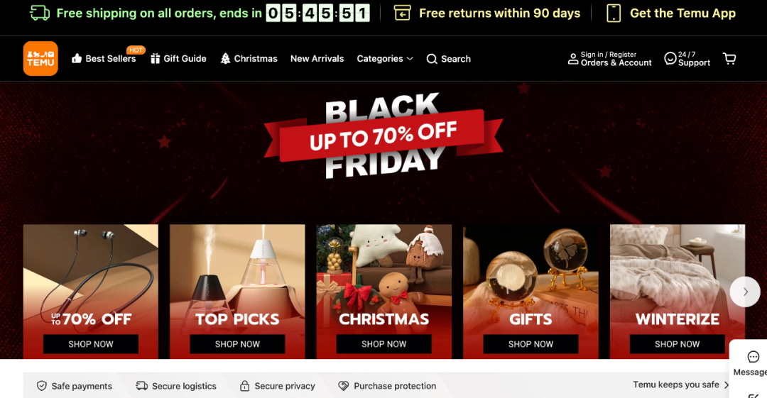 比如,新人補(bǔ)貼活動(dòng)專區(qū),用戶可通過(guò)優(yōu)惠券疊加以低價(jià)購(gòu)買(mǎi)到高價(jià)商品,優(yōu)惠券由平臺(tái)發(fā)放,優(yōu)惠的價(jià)格也由平臺(tái)承擔(dān);Temu特定的價(jià)格專區(qū),比如0元購(gòu),也是由平臺(tái)進(jìn)行補(bǔ)貼;而對(duì)于黑五這類節(jié)日促銷,平臺(tái)則通過(guò)特定的節(jié)日款,以額外曝光的方式進(jìn)行重點(diǎn)的流量投放。