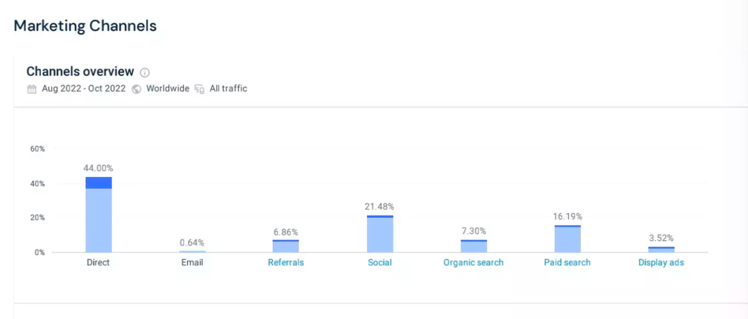 (圖為temu.com網(wǎng)站自2022年8月-10月的流量來(lái)源,數(shù)據(jù)源自Similarweb)