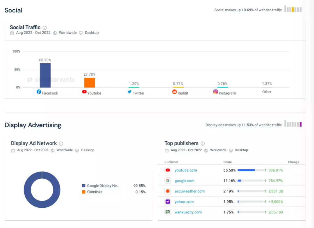 9-10月,Temu網(wǎng)頁(yè)端的主要流量來(lái)源是直接的自然流量(44%)、社媒營(yíng)銷(21.48%)、付費(fèi)搜索(16.19%)、自然搜索(7.3%)、聯(lián)盟營(yíng)銷(6.86%),以及展示廣告(3.52%)等等。其中,社媒流量主要來(lái)自Facebook (68.2%)和Youtube(27.7%),而展示廣告流量主要來(lái)自Youtube(65.5%),其次是谷歌(11.16%)。