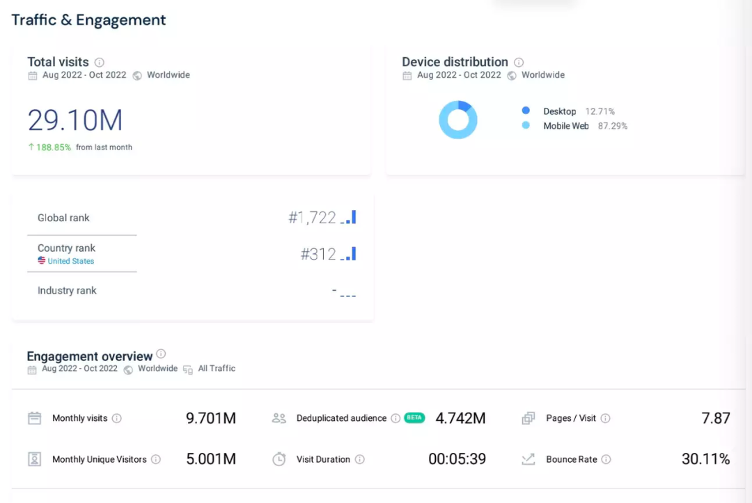 與此同時(shí),Similarweb的數(shù)據(jù)顯示,截至10月底,Temu全球PC和M端網(wǎng)頁(yè)的訪問(wèn)量已達(dá)2900萬(wàn),每月獨(dú)立訪客數(shù)達(dá)500萬(wàn)。