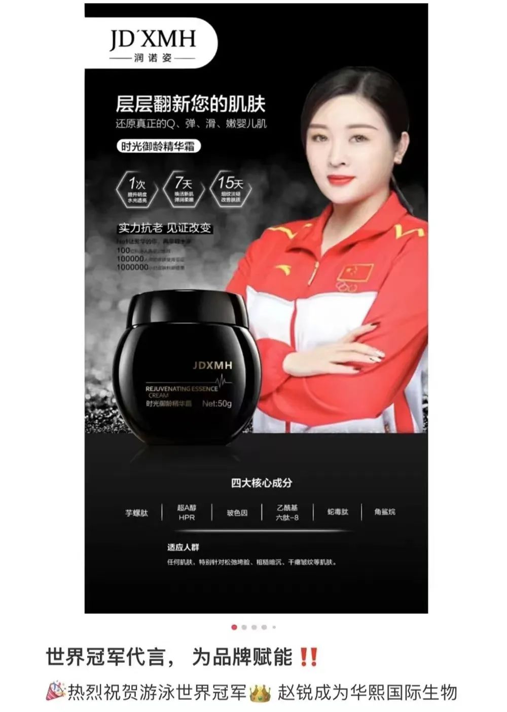 近日,在小紅書上,一個(gè)名為“JDXMH潤諾姿”的品牌發(fā)布了一款名為“時(shí)光御齡精華霜”的產(chǎn)品引起業(yè)內(nèi)注意,這款產(chǎn)品的外型與貴婦美妝品牌赫蓮娜的明星產(chǎn)品黑繃帶面霜極為相似,并配海報(bào)稱“游泳世界冠軍趙銳”為其代言人。
