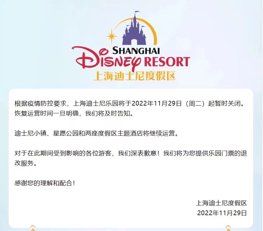 聯(lián)商快訊:11月29日,上海迪士尼度假區(qū)發(fā)布重要通知,根據(jù)疫情防控要求,上海迪士尼樂園將于2022年11月29日(周二)起暫時關(guān)閉;謴(fù)運營時間一旦明確,將及時告知。