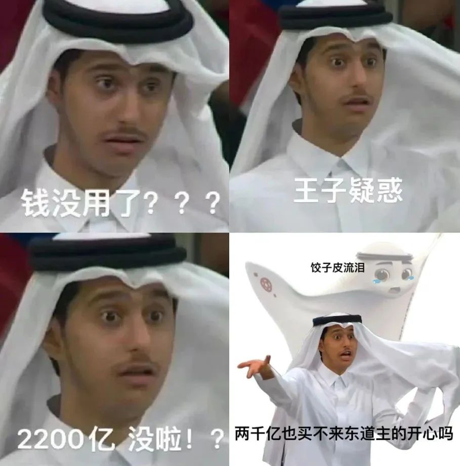 事實上,卡塔爾的其他觀賽成員,也被拍到了外泄的情緒表露。有網(wǎng)友為卡塔爾觀賽團(tuán)配上“氣鼓鼓”表情包,一位年齡較小的觀賽成員則被網(wǎng)友戲言口型十分像在喊“退錢”,拿著顯微鏡看球的粉絲們,甚至從王子們的眼神中看出了“憂郁”,在卡塔爾隊1:3輸給塞內(nèi)加爾后,有網(wǎng)友評論一片片白頭巾向場外移動,留下了“富而憂傷”的背影。