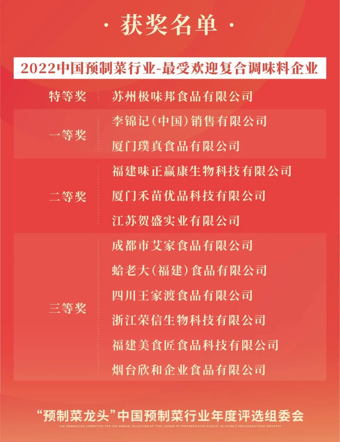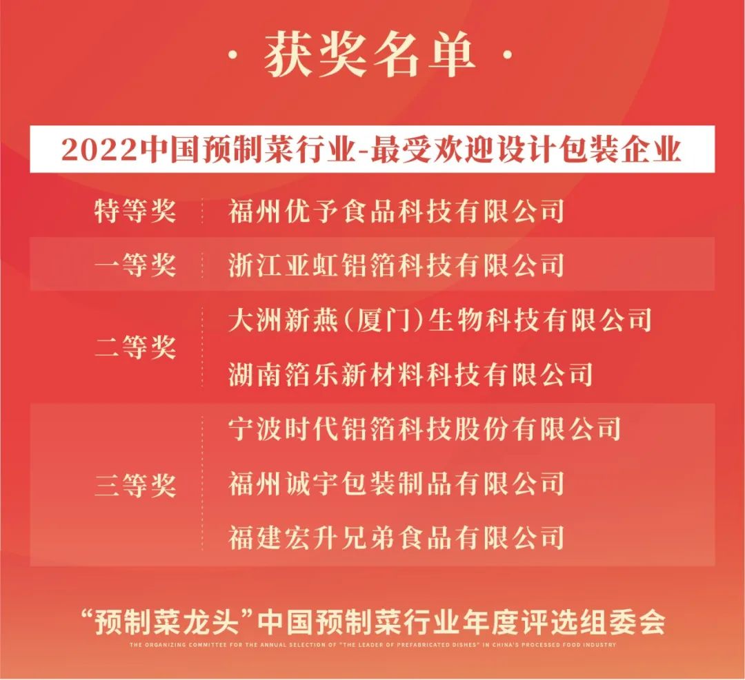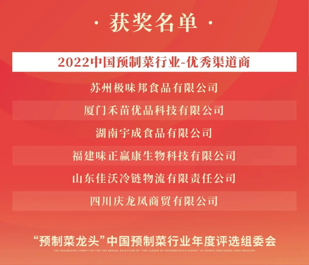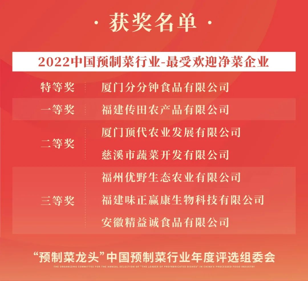 恭喜以上獲獎(jiǎng)的企業(yè)和個(gè)人!“‘預(yù)制菜龍頭’2022中國預(yù)制菜行業(yè)年度評(píng)選”頒獎(jiǎng)典禮將于2022年12月8日晚在福州“第2屆中國預(yù)制菜產(chǎn)業(yè)大會(huì)暨展會(huì)歡迎晚宴”上舉行!預(yù)制菜行業(yè)領(lǐng)軍品牌、卓越人物以及來自研發(fā)、渠道、水產(chǎn)品、肉禽產(chǎn)品、凈菜、復(fù)合調(diào)味料、設(shè)計(jì)包裝、機(jī)械設(shè)備等各領(lǐng)域的龍頭企業(yè)將薈萃福州,接受屬于他們的榮譽(yù),近百位行業(yè)大咖將驚艷亮相,并為獲獎(jiǎng)?wù)哳C獎(jiǎng)。讓我們一同期待這場(chǎng)高逼格的頒獎(jiǎng)盛典!