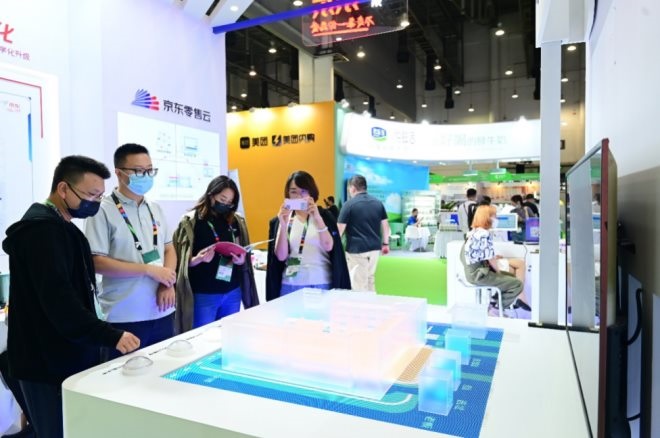 現(xiàn)場(chǎng),京東零售云搭建了門店數(shù)字化展臺(tái),以沙盤形式展現(xiàn)了京東零售云打造的從門店選址開始,到商品陳列等門店管理,再到進(jìn)銷存、CRM等后臺(tái)管理……覆蓋便利店經(jīng)營(yíng)全鏈路、全場(chǎng)景的數(shù)字化解決方案。