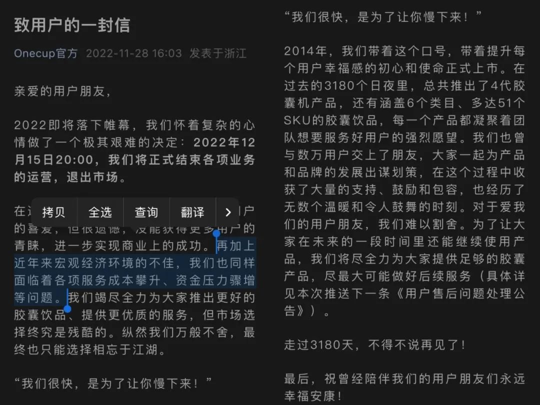 「Onecup」選擇退出市場的原因包括近年來宏觀經(jīng)濟(jì)環(huán)境不佳、各項(xiàng)服務(wù)成本攀升、資金壓力驟增等。