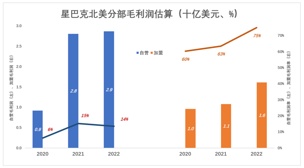 星巴克披露的信息有限,但仍可粗略估算自營、加盟各自的毛利潤。