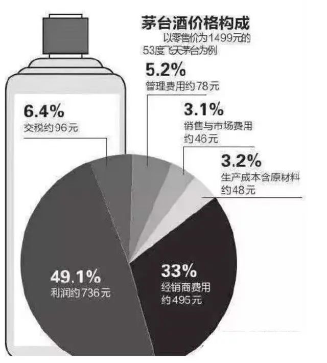 有專業(yè)人士曾分析過一瓶零售價(jià)為1499元的53度飛天茅臺(tái)的成本構(gòu)成:其中生產(chǎn)成本含原料約48元,占比3.2%;銷售與市場費(fèi)用約46元,占比3.1%;管理費(fèi)用約78元,占比5.2%;經(jīng)銷商費(fèi)用約495元,占比33%;交稅約96元,占比6.4%;利潤約736元,占比49.1%。