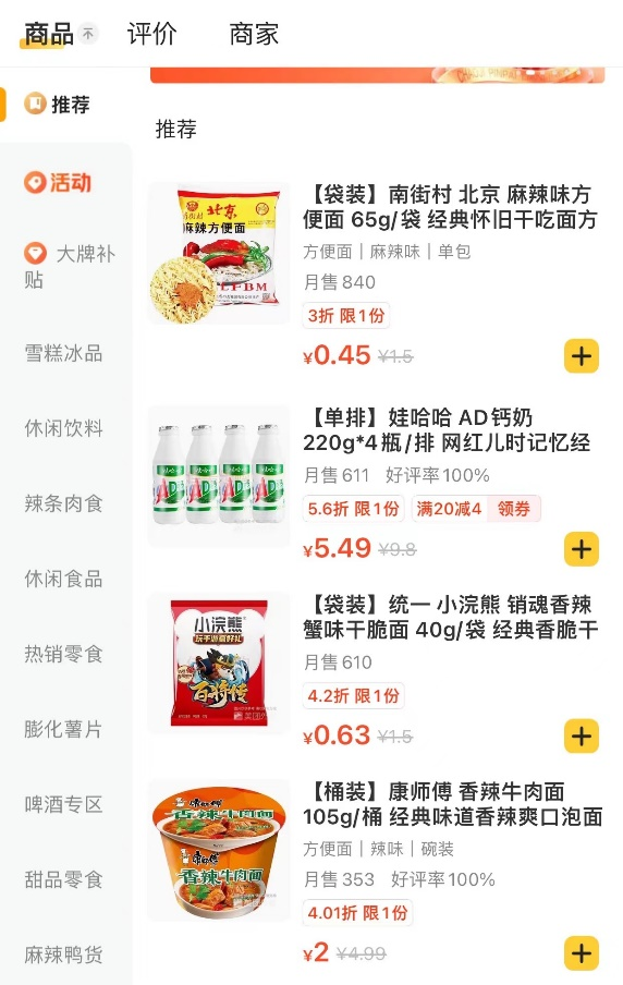 “懷舊零食一直都賣(mài)的很好,像小浣熊干脆面、AD鈣奶這種,我們都是放在外賣(mài)第一屏‘推薦頁(yè)’上的!北本┏(yáng)區(qū)三里屯附近一家主做線上外賣(mài)生意的便民超市店主表示,懷舊零食已成為門(mén)店的線上“引流款”商品,“顧客點(diǎn)外賣(mài)買(mǎi)零食,基本都是一單買(mǎi)很多種,吃的用的,店里其他商品銷量也被帶動(dòng)起來(lái)。”
