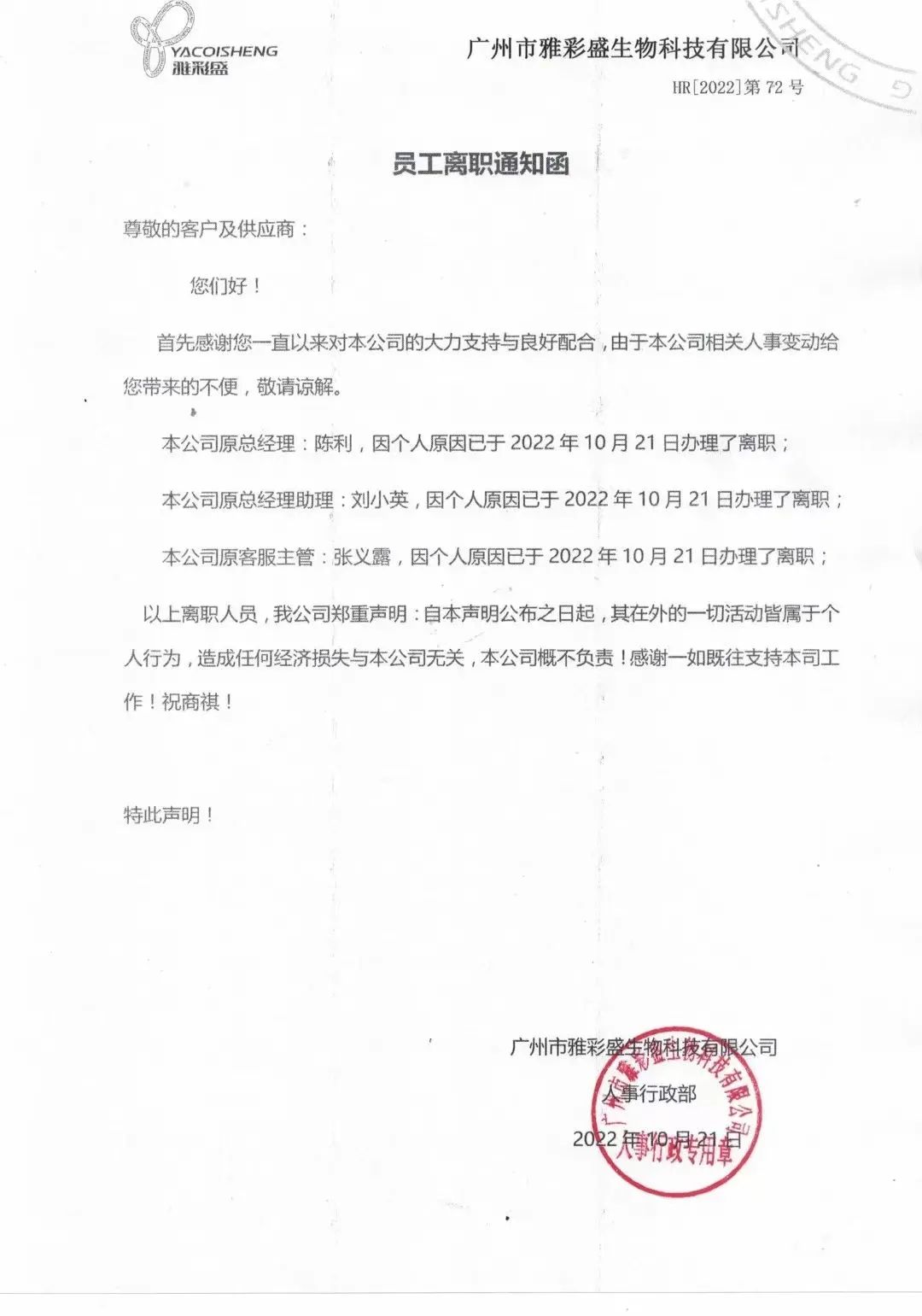 青眼調(diào)查了解到,早在10月21日,雅彩盛就發(fā)布了一則員工離職通知函,上面顯示:公司原總經(jīng)理陳利、公司原總經(jīng)理助理劉小英、公司原客服主管張義露皆因個(gè)人原因選擇離職。