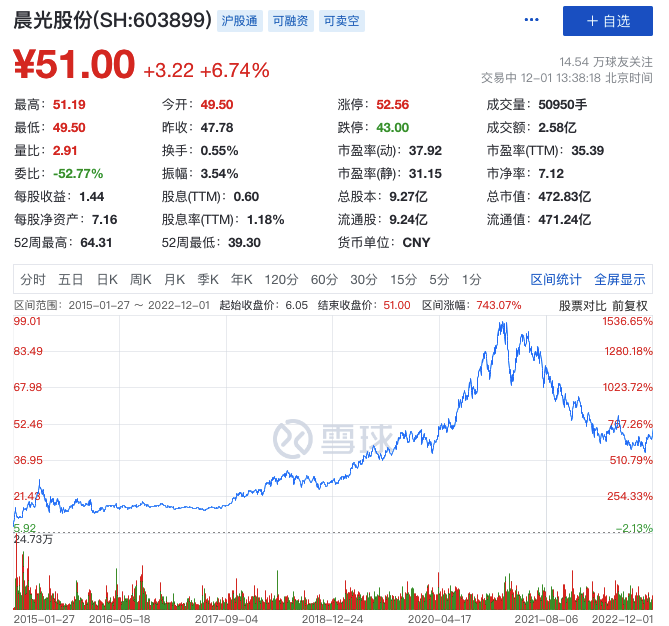 2021年2月,晨光文具股價達到100.27元的歷史高點,市值超過千億,距其上市之初的72億元市值,6年時間增長15倍,因而被稱為“文具茅”。