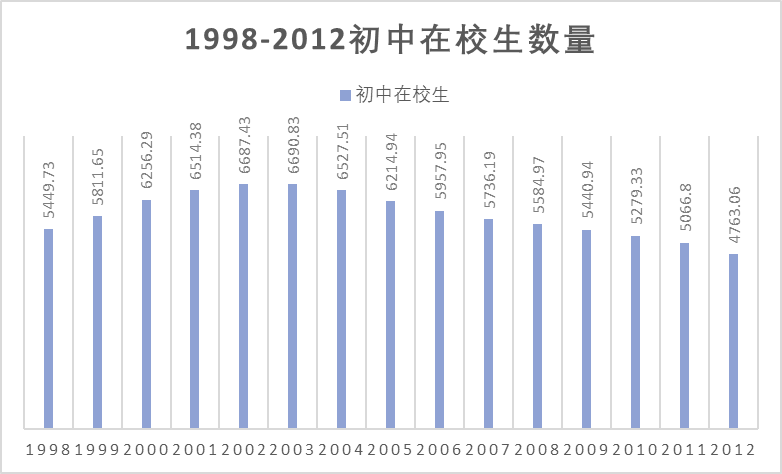 雖然中國出生人口在1987年之后逐年減少,但由于九年義務(wù)教育的普及,初中在校生數(shù)量的增長一直延續(xù)到2003年,并且2012年之前,一直在5000萬以上。