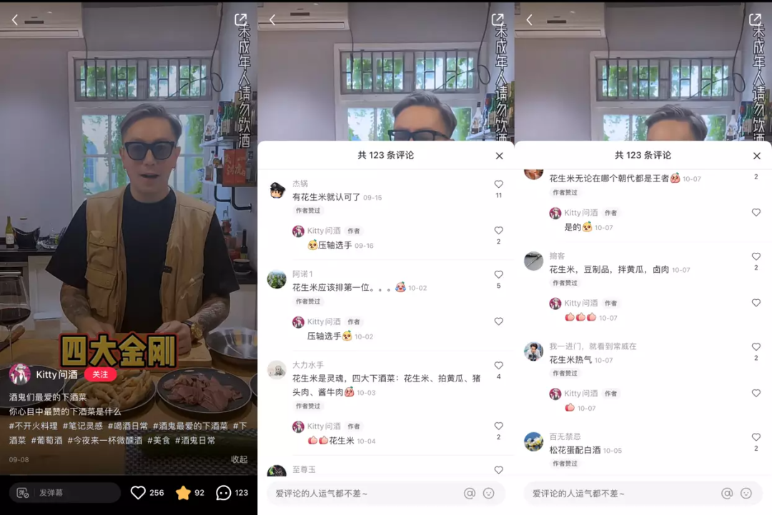 然而,盡管消費(fèi)者中存在自發(fā)購(gòu)買下酒零食的行為,但在抖音、小紅書平臺(tái)的“下酒零食”“世界杯零食”“看球”等相關(guān)關(guān)鍵詞下,除了瓜子花生之外,總的來(lái)說被提及的零食品類還很分散,暫時(shí)沒有那個(gè)品類能像下酒王者花生米一樣得到廣泛的、集中的提名。