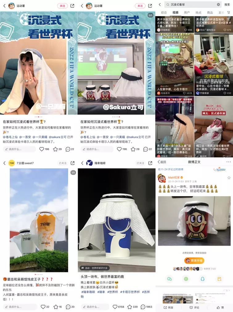 這樣多元化的流量入口和互動(dòng)方式,也給了品牌更多的營(yíng)銷靈感。比如不少品牌選擇模仿網(wǎng)友“沉浸式看球”,給產(chǎn)品戴上“頭巾”打卡一張“世界杯觀球氛圍照”。