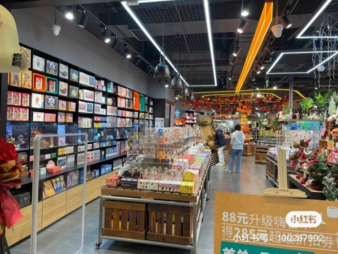 華南首店由于開(kāi)設(shè)恰逢12月圣誕季,大量的燈帶和紅色番茄玩偶從天花板垂下,首店圣誕氣息濃厚。此外,首店延續(xù)了北京門(mén)店的市集式的陳設(shè)風(fēng)格,給消費(fèi)者帶來(lái)逛集市的悠閑感。