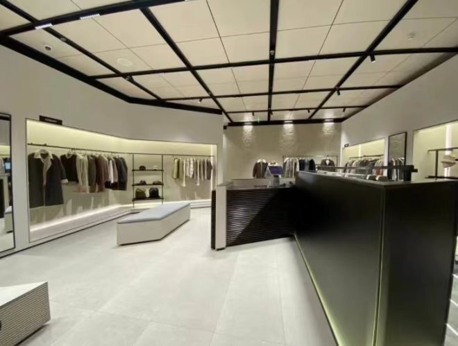 品牌首店以低飽和度的墨綠色和灰咖色為主色調(diào),展示臺(tái)和衣架按照不規(guī)則形狀擺放,天花板由黑色長(zhǎng)形裝飾物構(gòu)成,為首店增添了一些超酷氛圍。