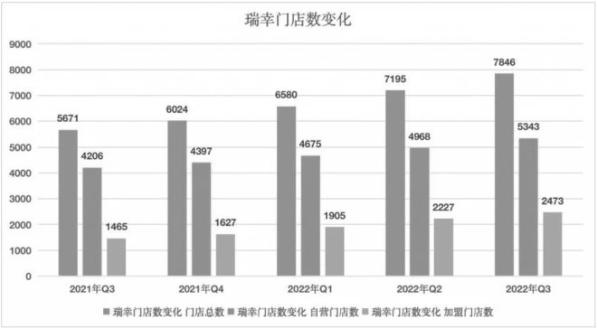 另外,財(cái)報(bào)顯示,瑞幸第三季度凈新開(kāi)門店為651家,較2022年第二季度末的門店數(shù)量環(huán)比增長(zhǎng)9.0%,截至第三季度末為7846家門店,其中包括5373家自營(yíng)店和2473家合作店。